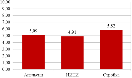 Средний балл по всем факторам показал, что «тайные покупатели» наиболее высоко оценили обслуживание в сети «Стройка» (5,82 балла) (рис.3.13).