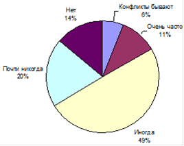 Анализ конфликтных ситуаций показал, что в основном конфликты бывают иногда у 9% опрошенных. Частые конфликты всего у 11% сотрудников. Не бывает конфликтов у 14% сотрудников.